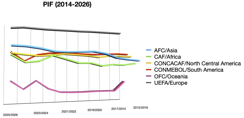 The Power Index of Federation (PIF) is the primary metric used in the KA System, calculated as a percentage. It reflects the overall strength and attraction of a continent from the viewpoint of club football (soccer). The sum of all PIFs equals 100%. The Continents Ranking is determined by the PIF value, with the highest score attaining first place. PIF is utilised for both the KA Football Leagues Global Rating and the KA Football Club Global Rating.