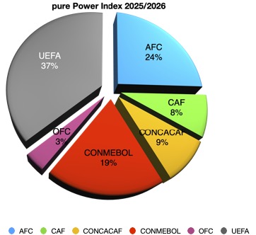 Pure Power Index of Federation (pure PIF) measures the inherent strength and appeal of the continent from club football perspective. It does not account for the effect of uneven distribution of investment capital or the obstacles posed by regulations.